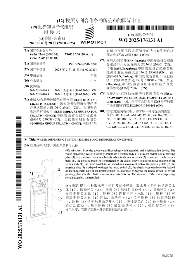 证券之星消息,根据企查查数据显示美的集团(000333)公布了一项国际专利申请,专利名为“取水开关组件及制冷设备”,专利申请号为PCT/CN2025/077900,国际公布日为2025年8月28日。